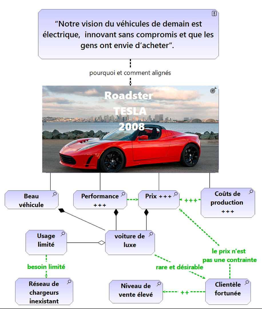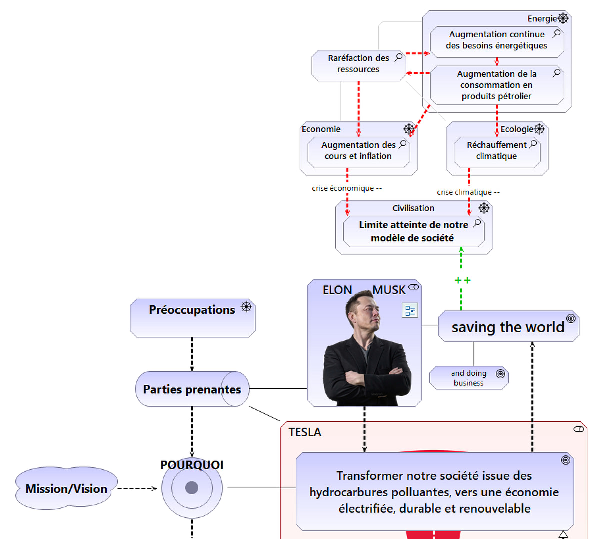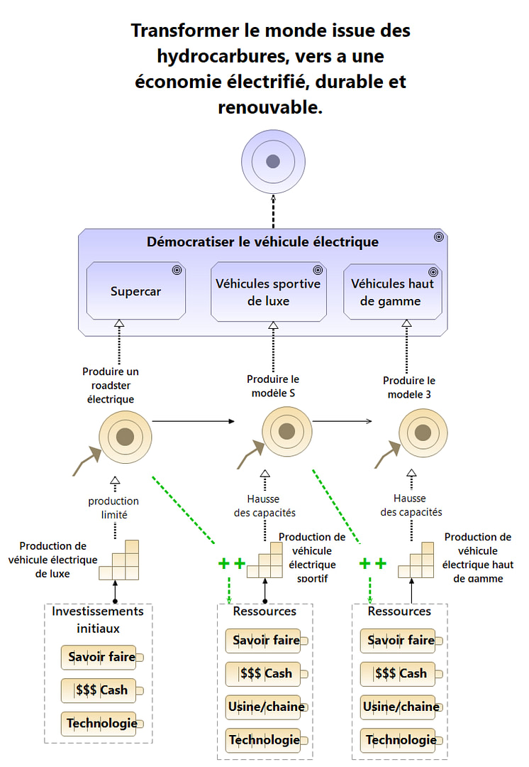 Avant d'essayer de rentrer dans le cerveau d’Elon Musk pour décrypter la stratégie de Tesla. Sachez que les schémas de cet article sont réalisé à l'aide de la notation Archimate. C'est une boite à outils qui vous permettra d’apporter information et compréhension pour décrire vos métiers, votre projet, votre système d’information et votre stratégie. J’espère vous convaincre que la modélisation est une compétence utile (et pas uniquement réservée aux spécialistes).